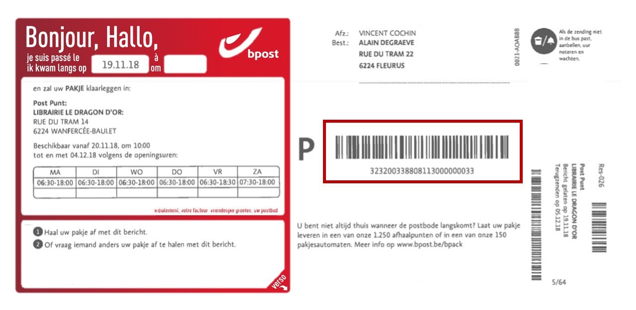 C’est le cas lorsque le code-barres commence par la lettre U. Les codes-barres qui commencent par « U » sont uniquement créés pour présenter les envois à la douane. Ce type d’envoi est exempt de Track & Trace. Il peut s’agir d’un choix de l’expéditeur ou du destinataire lors de l’achat dans la boutique en ligne.