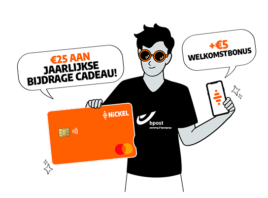 *Voorwaarden van de aanbieding: de €30 (€25 + €5) wordt binnen de 24 uur na opening teruggestort op je Nickel-rekening. Geldig tot 28/02/2026 en enkel voor bpaid-klanten. De aanbieding is niet overdraagbaar en kan niet in cash worden uitbetaald. Meer info in je Postkantoor of op nickel.eu.